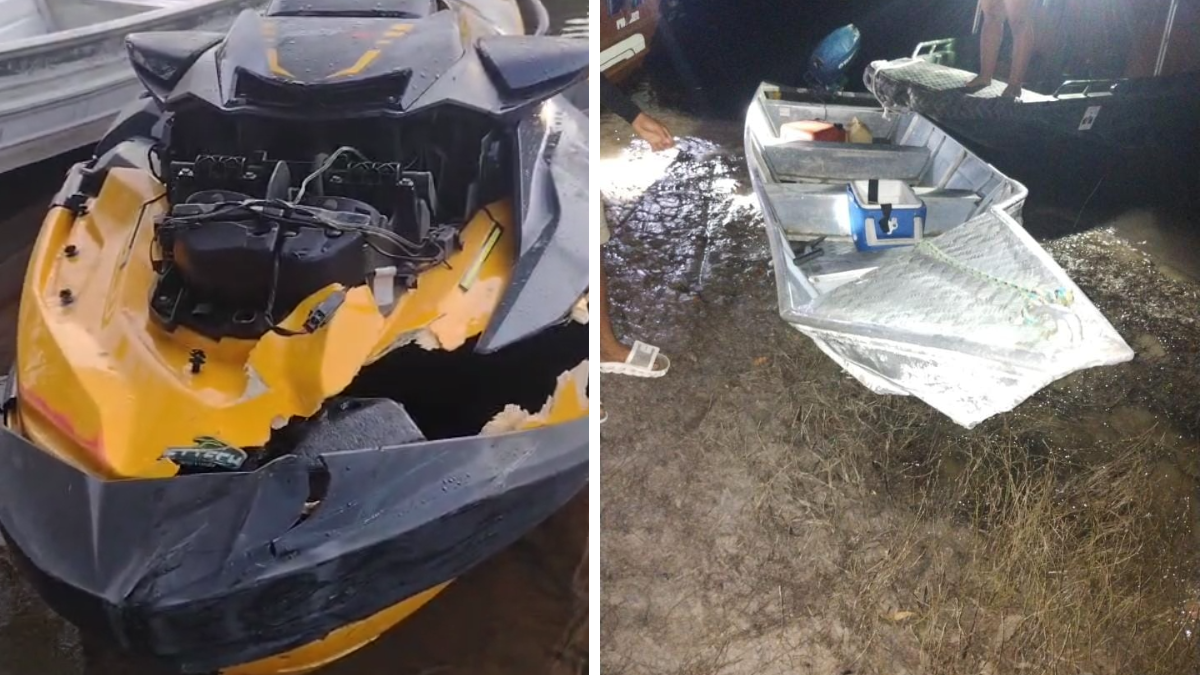 Imagens que circulam nas redes sociais mostram a moto aquática com a parte frontal completamente destruída. A lancha de alumínio atingida também sofreu danos severos na proa, evidenciando a força do impacto.